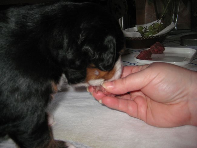 Was für ein Sonntagmorgen Heute! Meine Mädels sind heute 3 Wochen alt und schon fertige kleine Hunde. Erst haben Frauchen und Evi die Kleinen heute morgen gewogen. Sie waren sehr zufrieden. Ich war dann sehr erstaunt, als sie mir die Kleinen nicht wieder in das Welpenbett gebracht haben. Jeder Kleinen wurde nämlich wieder eine Wurmkur ins Mäulchen gegeben. Das fanden sie total eklig. Aber Frauchen wusste gleich Rat. Am Tisch standen kleine Fleischportionen. Meine klugen Mädels haben gleich gewußt wie lecker das ist. Sie haben die erste Fleischportion in ihrem Leben super toll gefunden und mit Wonne verspeist. Ich habe dann im Welpenbett gewartet und die Zwerge ordentlich geputzt. Weil die Sonne heute so schön scheint, machen wir am Nachmittag mit den Zwergen auch einen kurzen Terrassenausflug. Das wird nochmal sehr spannend und aufregend für uns. Keine Sorge, ich geb schon acht auf alle.