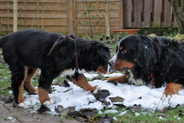 Wie versprochen, ich erzähle Euch von meinen Besuchen. Gestern sind wir also zu Papa gefahren. Ich durfte ohne Mama und Molly mit. "Damit ich selbstständig werde" haben sie gemeint. Im Auto hinten ganz alleine habe ich mich zuerst nicht so gut gefühlt. Aber dann war es schon ok, schließlich muß ich ja selbstständig werden. Also, Mamas Schwiegerfrauchen, ist das nun mein Menschen-Oma-Frauchen???, hat sich sehr gefreut mich zu sehen. Ich war zuerst wiedermal sehr schüchtern, aber Evi und Frauchen sind ganz normal in das Haus gegangen, also bin ich eben hinterher gelaufen. Zuerst habe ich nur Artgenossen bellen hören. Die waren im Garten, damit ich mich in Ruhe umsehen konnte. Dann haben sie die Türe aufgemacht und ich bin erstmal abgehauen. Ich glaube ich habe auch ein bisschen geschrieen und musste Pipi machen. Zwei riesengroße Bernermänner kamen nämlich angestürmt und ich hatte Sorge sie überrennen mich. Aber ich bin auch sehr neugierig, also kam ich gleich zurück und habe nachgesehen. Und was glaubt ihr, vor mir stand ein wunderschöner Prinz, mein P A P A ! Und Mollys Bruder Onkel Chester. Der hat sich gleich um mich gekümmert, mich beschnüffelt und betütelt. Er war sehr, sehr nett, aber mein Papa, Prinz Alessio ist einfach super toll. Ich konnte nur staunen wie super der ist. Er hat auch mit mir gespielt, als er mich ganz lieb begrüßt hatte. Ein bisschen war es mir peinlich, daß ich vor ihm erst so erschrocken war. Aber er ist auch so imposant und groß, da kann man als kleines Mädchen schon erst mal beinah versehentlich Pipi machen. Ich habe mich dann von meiner besten Seite gezeigt, war sehr brav und habe auch mein Nachmittagsessen ganz verspeist. Zum Abschied hat Papa dann nochmal mit mir gespielt und ich überlege jetzt dauernd, ob ich nun auch Prinzessin bin. Es war alles sehr aufregend. Dagegen war heute Nachmittag alles Pipifax. Ich habe in der Welpenschule viele andere Artgenossen getroffen, musste Leinelaufen lernen und Sitz und Platz machen, das kann ich ja schon. Am Samstag gehe ich mit Evi in eine "Spielstunde" das wird sicher auch nett! Bis dahin,