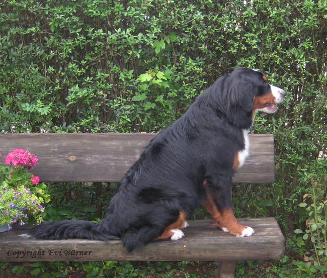 Der coolste Berner kann das ja fast nicht aushalten! Knapp unter 40 Grad lässt auch meine Energie erheblich nach. Nachdem aber auch Frauchen ziemlich down ist, reicht es immer noch, um sie stöhnen zu lassen. Frauchen ist nämlich Morgens sehr früh, nicht so gut drauf. Da gehen wir aber derzeit schon unsere Runden. Also stolpert sie mit Evi und uns Dreien über die Felder und ist noch müde. Ich bin schon ganz munter und mein Interesse für die Natur ist total wach. Danach habe ich versucht ein großes Loch zu graben, direkt am Zaun, wegen des Überblickes, aber das hat sie bemerkt! Eine Kuhle unter den Sträuchern war dann aber doch erlaubt. Ich habe ein paar Ästchen und Zweiglein gesammelt und dazu gelegt, um dann, wenn es richtig heiß ist im kühlen Gras etwas Beschäftigung zu haben. Meinen Kauknochen habe ich auch dazu geholt. Das fand Sie ja dann ganz witzig. Aber als es dann Nachmittags noch heißer wurde, habe ich mich ins kühle Waschhaus verkrümelt. Das war zwar schon von Mama Tana besetzt, aber Frauchen meinte, "Raum ist in der kleinsten Hütte" und Hauptsache es gibt eine kühle Ecke! Wenn dann am Abend die Luft etwas besser wird, dann hole ich aber nach, was ich am Tag versäume! Gestern z.B. hatte ich einen Turborasanfall und bin durch den Garten gefegt und dann in mein Planschi gesprungen, das war sehr lustig. Zerrspiele sind mein Liebstes und ich habe meinen Ball mit Schnur geholt und Frauchen animiert mit zu machen. Seit dem hat sie eine kleine Macke an ihrem Finger und ich konnte ihr zeigen wie viel Kraft ich habe. Ach ja, und ich kenne nun auch Eis!! Vanille ist total super!!
