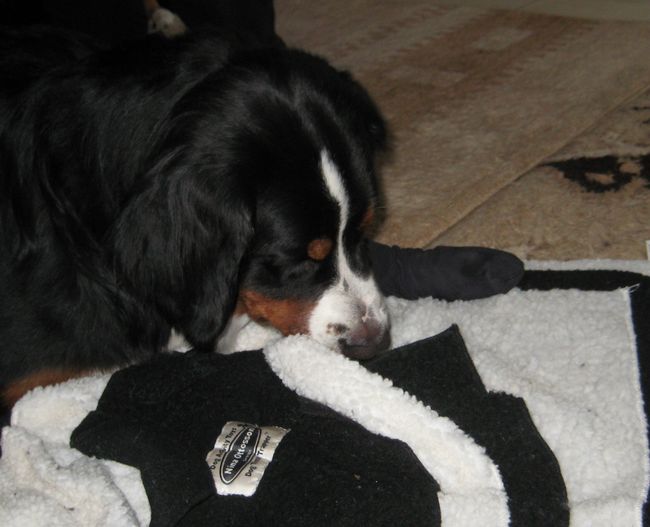 Hier mit unserer Schnüffeldecke! Die holen sie immer, damit ich die Langeweile überstehe und ausgelastet bin. Da drin sind Leckerle versteckt und Molly, Tana und ich erschnüffeln dann alle Leckerle um die Wette. Ein bisschen Spass muss sein....