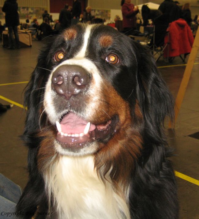 Oh je, oh je, kaum haben wir den Weihnachtsstress und die Sylvesterböller hinter uns gelassen, dachte ich, nun können wir zur Tagesordnung übergehen und in Ruhe frühstücken und unseren Schneespaziergang machen! Aber nein, ich musste heute Morgen schon wieder früh raus. Spaziergang fiel aus, es war nur ein kurzer Gassiwiesenbesuch,angesagt. Dann rein ins Auto, mit Sitzen für die Zweibeiner und zum Glück etwas Proviant für mich. Ich kannte das schon, ich musste wieder mal zu einer Ausstellung. Ja, wie oft denn noch??? Sie wissen doch selbst, das es an mir nix auszusetzen gibt!!! Aber manche Zweibeiner, dazu gehören wahrscheinlich meine, brauchen etwas länger um etwas zu checken. Also nix wie rein, in die laute Halle und dann hieß es erst mal warten, warten. Es wären so viele nette Spielgefährten da gewesen und auch ein paar ganz nette Hundemänner. Aber damit ist wohl nichts, man muß artig bei seinen Leuten sitzen und nett gucken. Gott sei Dank kamen immer mal nette Zweibeiner vorbei. Da wurde ich dann wenigstens gekrault und durfte etwas schmusen. Endlich waren ich und Evi dran. Ich musste wieder Zähne zeigen, sind ja bekanntlich ok, dann wurde meine Rute überprüft. Das finde ich aber nicht ok. Kein "Fremder" hat an meinen Schwanz zu langen!! Das wäre aber Evi sicher nicht recht gewesen, wenn ich Faxen gemacht hätte. Also, wenn es schon nicht anders geht!!! Dann musste ich wieder mal ordentlich stehen und durfte endlich ein paar Runden laufen. Also was soll ich sagen, ich bin ein "vorzügliches" Berner-Mädchen und Platz 4 war diesmal meiner:-)