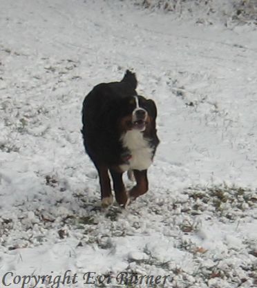 Es ist kalt, es ist eiskalt, und es gibt Schnee, der nicht weggeht. Ich möcht am allerliebsten immer draußen sein. Was für ein toller Winter. Nur Frauchen ist immer ein "Spielverderber." Sie holt mich immer wieder ins Haus und sagt "ES ist zu kalt"!!! So ein Quatsch ! Ich habe mir so einige Spielsachen organisiert, viele Stöcke, die der Sturm vom Baum geholt hat, Frauchens "Zierkürbisse" die so wie so keine Zierde mehr sind, und sehr interessant ist auch der Busch wo sie immer so Dinge ran hängen. Sie sagen es ist Vogelfutter, für das Federvieh (Frauchen sagt zu ihnen Piepmätze, wie komisch). Damit könnte ich mich den ganzen Tag beschäftigen. Es macht so viel Spass!! Aber kaum bin ich ein Stündchen draußen, rufen sie mich schon wieder, immer wenn es besonders interessant ist!!! Mama Tana ist da auch für nix zu gebrauchen. Sie sitzt doch tatsächlich am liebsten bei Frauchen im Haus und wärmt sich das Fell. Ich glaube die hat vergessen, daß sie doch eine echte Bernerin ist! Hoffentlich bleibt es noch ein bissle so, aber Frauchen schielt schon nach "Frühling" wie sie sagt. Sie braucht nun überall schon so was "Blühendes", so Grünzeug, wie Tulpen! Damit könnt ihr mich jagen, was Handfestes ist mir lieber....bin mal kurz draußen...
