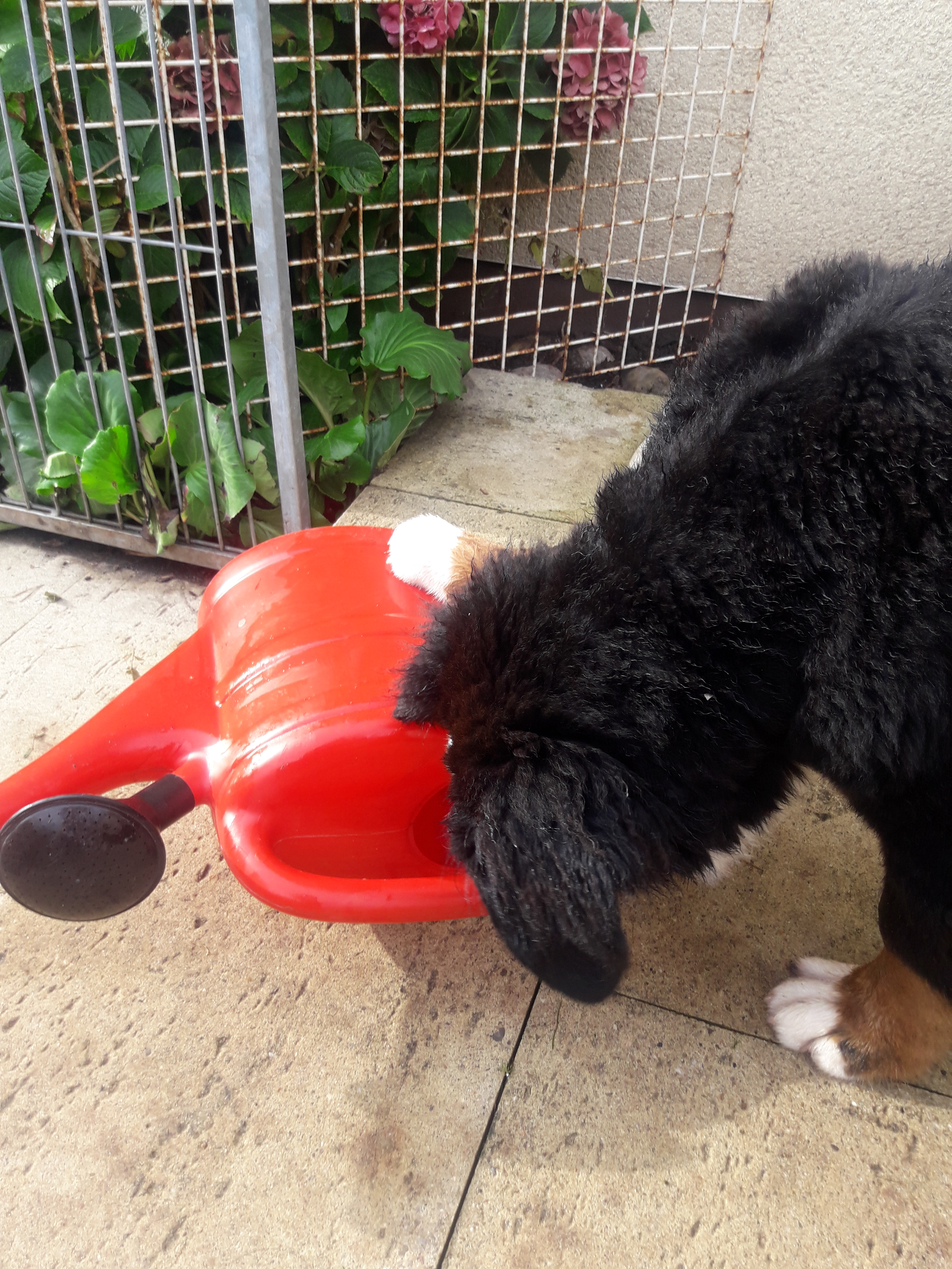 Also, ich der Elias bin ja kein so begnadeter Gärtner. Da soll Mama ja schon ein anderes Kaliber gewesen sein. Da waren sie angeblich ständig in irgendeinem Gartenmarkt unterwegs um neue Pflanzen heran zu schaffen. Der gefielen die, die gewachsen sind, immer nicht. Ich hab es ein paar mal mit Pflanzlöchern versucht. Aber puuh, das ist viel zu anstrengend für mich. Nee, das laß ich mal lieber. Diese Reinigungsprozedur im Anschluß daran, steht doch in keinem Verhältnis zum Spass den man da angeblich hat. Ich interessiere mich aber trotzdem sehr für Wasser. Wir haben da so ein Plantschi, da steh ich immer drin und schaufle Wasser. Das ist viel einfacher wie Erde schaufeln, und wesentlich effektiver. Wenn ich dann klitschnass durchs Wohnzimmer sauße, ist Frauchen immer sehr begeistert. Ja und bei uns stehen da immer so Dinger, ich glaube die heißen Gießkannen , mit Wasser herum. Da kippe ich dann, da bin ich dann auch naß, und erledige die Dinger. Also ich hau die im Garten einfach herum. Macht total Spass und so richtig Radau. Da wissen sie dann immer genau wo ich tätig bin. Es gibt da mehrere davon, rot, blau, grün und ich erledige sie alle. Ich weiß jetzt auch die Orte, wo sie immer plaziert sind. Frauchen wollte eigentlich immer das Wasser für ihre Blumen haben. Ich finde, den Spass den ich beim Ausleeren habe, ist wichtiger. Müssen halt wieder Wasser anschleppen. Das schaffen die schon!
