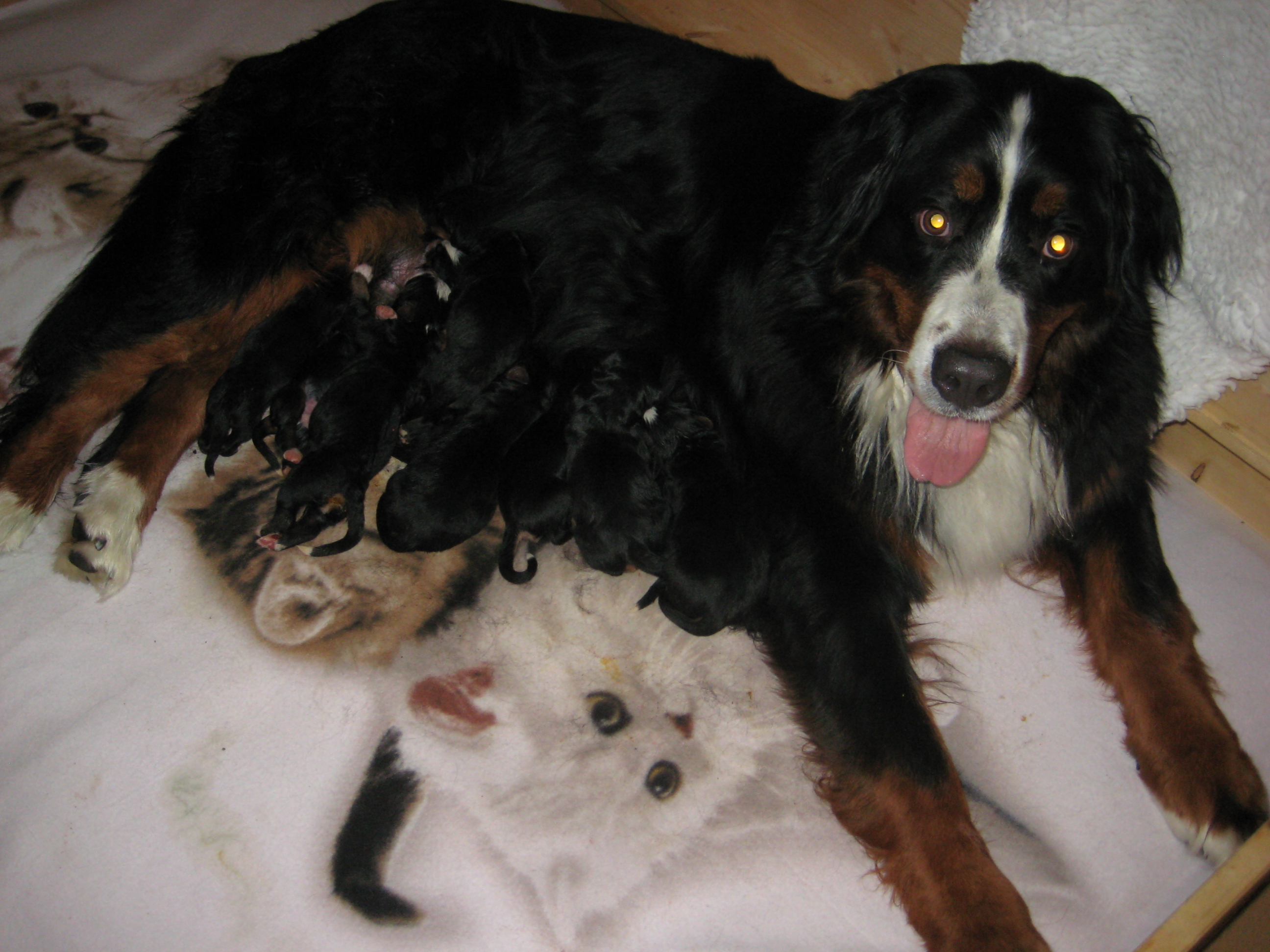 Nun bin ich also Mama! Ich bin ja sooo froh, daß die Süßen gut angekommen sind. Es ging ja schon vorletzte Nacht los. Da habe ich Evi wach gehalten, weil mein Bauch so dick war, das ich dachte ich platze. Ich habe gerade noch meinen Weg unter den Tisch gefunden. Dort habe ich dann den Morgen verschlafen. Da dachten sie dann es wäre noch etwas Zeit. Aber Pustekuchen, nach dem Mittagessen ging es so richtig los. Meine Hechelei wollte gar nicht mehr aufhören. Abends gingen dann die Wehen los, ganz viele und immer heftiger, bis dann endlich um 23 Uhr der erste Welpe, mein Töchterchen geboren war. Nach Mitternacht kam dann mein erster Sohn. Oh Mann was für ein Brocken, den musste ich erst mal heraus bringen. Danach ging es dann im Wechsel so weiter und ich habe meine Geburtshelfer ganz schön ins Schwitzen gebracht. Das Frauchen von meinem Papa war eine ganz große Helferin für mich. Als die Nummer 7 anmaschiert kam, dachten Sie, das war es nun. Sie hätten sich denken können, das ich mal eine Pause brauchte. Ein Töchterchen kam dann Morgens im Garten zur Welt. Es ist einfach ins nasse Gras gepurzelt. Danach sind wir dann in die Wurfkiste unten umgezogen, dort habe ich dann noch ein Bübchen zur Welt gebracht. Und als dann alle auf dem Weg zum Doc waren, wegen Kontrolle und so, meine Kleinen waren schon im Korb im Auto, das purzelte schnell noch ein Mädchen in die Welpenstube. Nun sind es 10 kleine Bernerlein, 5 Mädels und 5 Jungs. Da haben wir nun ganz schön viel zu tun. Aber das schaffen wir schon und was soll ich Euch sagen, sie sind alle bildhübsch und ich bin eine glückliche Mama