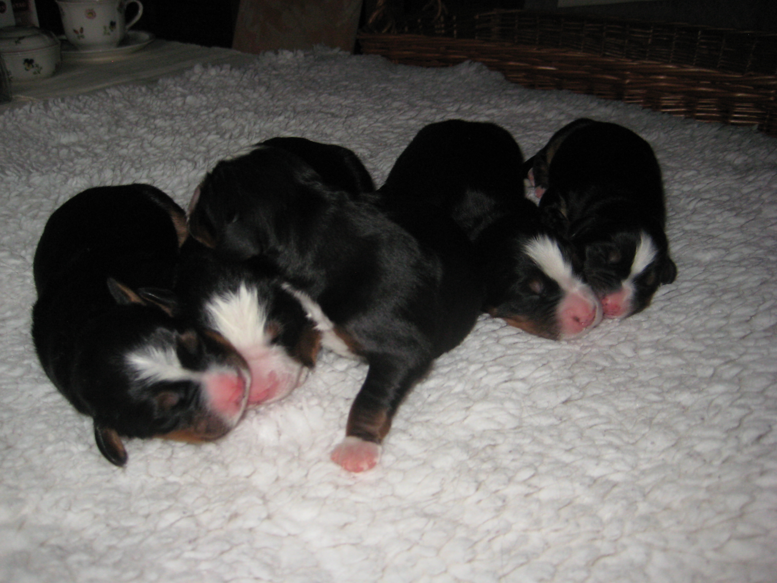 Evi sagte, ich bin perfekt! Für mich läuft zur Zeit ohne meine Kleinen nix. Am liebste würde ich sie auch zum Pipi machen im Garten mitnehmen. Das ist natürlich nicht erlaubt. So sind sie also gestern alle in einen Korb gepackt worden und mit mir zum Doc gefahren. Der hat alles kontolliert und gemeint ich habe alles BESTENS gemeistert. Dann hat er meine 10 kleinen Bernerlein begutachtet und gesagt alles OK. Na klar, sind ja meine Kinder! Ich habe genug Milch für alle und Evi war ganz zufrieden mit der letzten Nacht, die wir prima geschlafen haben. Alle meine Kinder bei mir am Bauch. Evi schläft nämlich direkt neben mir auf einem Notbett. Sonst schlafe ich ja immer neben ihrem Bett. Den "Umständen" entsprechend ist dies nun umgekehrt. Heute Morgen haben sie dann alle auf die Waage gelegt und sagten alle haben schon zugenommen. Da haben sie gesehen, wie gut ich mich gekümmert habe. Ich gebe also mein bestes und Frauchen sagte, das aus meiner wilden Hummel,