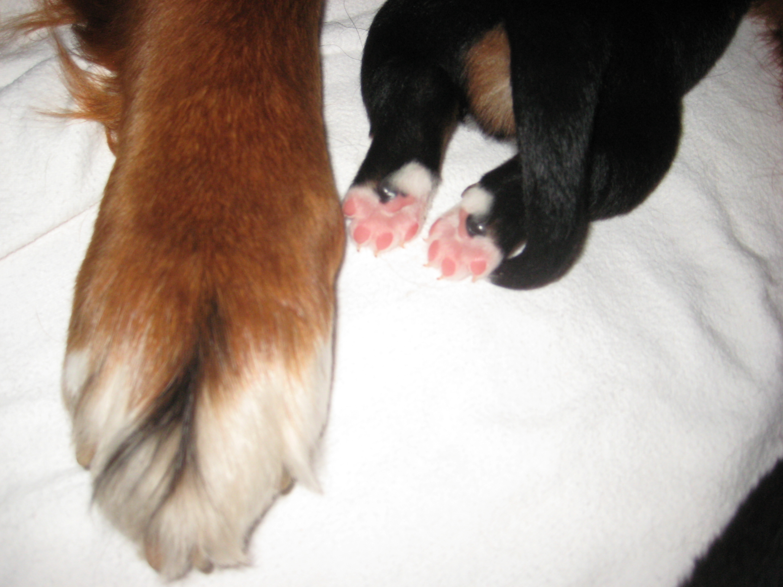 Wir hatten eine kurze Nacht, den ich wollte eigentlich schlafen. Aber meine Rasselbande hatte Hunger! Also bin ich in die Welpenwohnung gestiegen und habe erstmal alle durchgeputzt. Dann haben wir von 2-4 Uhr Nachts gefüttert. Frauchen oder Evi, die ja immer noch neben mir im Wechsel schlafen, waren natürlich dabei und haben geachtet, das niemand zu kurz kommt. Eine "Schallgrenze" haben wir locker überschritten, alle wiegen über 1000gr. Einer meiner Jungs wiegt sogar schon mehr als 1200 gr. Nur meine Prinzessin Eleni, meine Kleine, muß noch zulegen. Aber was glaubt Ihr, wenn die Süße nicht die richtige Zitze erwischt, man kann sie da loslegen. Ist glaube sie jetzt schon eine verwöhnte Zicke, aber soooo süß und putzmunter!