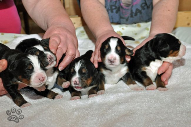 Meine Kleinen können mich sehen! Alle Äuglein sind geöffnet und blinzeln in die Welt. Die kleinen Öhrchen sind geöffnet, sie können hören. Frauchen meint immer, das sind alles kleine große Wunder. Da ich ja so viel Kinder habe, versuchen meine beiden Kindermädchen schon mal Welpenmilch vom kleinen Schälchen zu geben. Aber da hält sich die Begeisterung noch in Grenzen. Meine Milch ist die Beste und wenn ich dabei bin klappt es so wie so nicht. Da wollen sie nur zu mir. Mein "Personal" will es alle Tage weiter versuchen, bis es klappt. Nur zu meiner Entlastung meinen sie. Dabei weiß ich gar nicht, ob ich das will. Und weil mein Personal so gut funktioniert, bin ich letzte Nacht in mein Hundebett zu schlafen. Schließlich muß ich doch nicht mehr in dem Welpenbett schlafen, wenn daneben gleich die Evi auf dem Notbett schläft. Genügt doch vollkommen, wenn einer schlecht schläft. Sie sagen doch immer, ich bin eine moderne Mutter und außerdem sind sie von den Kleinen sowieso hin und weg.
