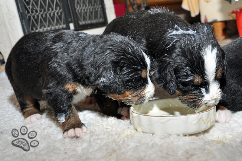 Gestern musste Frauchen einen Termin wahrnehmen und da traut sie mir alleine wohl nicht ganz. Auf jedenfall ist Papa Alessios Frauchen gekommen und hat uns bewacht. Und sie hat alle 10 Kleinen beknuddelt und wieder ganz tolle Fotos von uns gemacht. Dabei hat sie auch festgehalten wie meine Süßen aussehen, wenn sie durch ihren Brei stapfen. Na ja, die Hauptarbeit lassen sie wie immer mir machen. Ich musste wieder alle 10 Welpies sauber schlecken. Und da jammert Frauchen wegen der Wäsche....