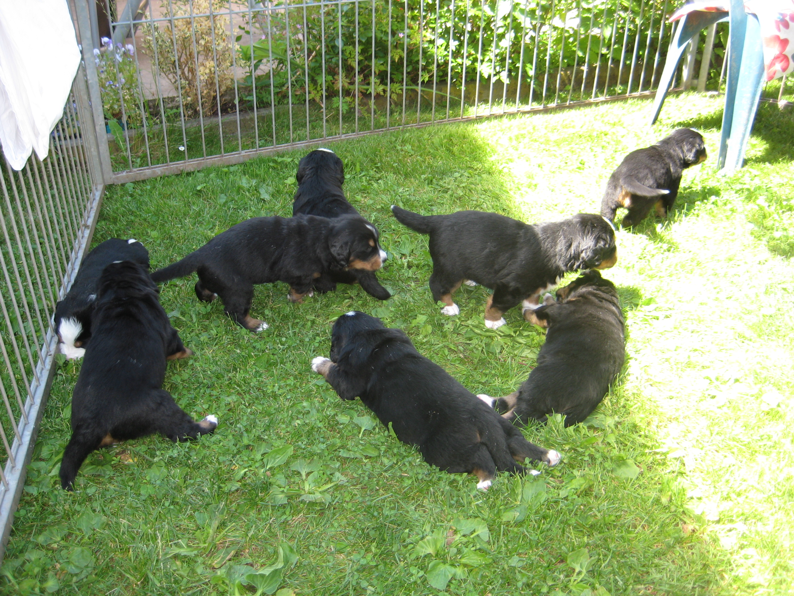 Was für ein Tag und was für eine Nacht!!! Meine Süßen mussten gestern erst mal wieder eine Wurmkur machen. Oh pfui, da wird immer geschüttelt und gespuckt. Echt grässlich. Auch Oma Tana und Ich mussten so ein Ding schlucken. Danach gab es aber gleich für jeden ein leckeres Fleischbällchen. Das versöhnt dann wieder etwas. Nach dem Wiegen wurden dann wie immer alle in die Wurfkiste verfrachtet. Und was soll ich sagen, fast gleichzeitig ging das Welpenkonzert los. Meine Kleinen durften ja die letzte Woche immer im Wohnzimmer mit mir kuscheln. Nun hat es ihnen in ihrer Kiste nicht mehr gefallen. Außerdem, da haben sie schon recht, langsam wurde es eng im Welpenkistchen. So ging das Konzert dann ziemlich lautstark immer mal wieder von vorne los. Sooo sagte da Frauchen zu Evi, nun wird es Zeit für die Welpenvilla. Da sind heute Morgen dann alle ziemlich emsig bei der Arbeit gewesen und haben die letzten Vorbereitungen für unseren Umzug getroffen. Ich habe dann kontrolliert, ob sie nix vergessen haben. Aber, sie haben alles sehr wohnlich gemacht, mit Decken und Kuschelkissen und Stofftieren. Herrchen hat vor der Villa den kleinen Welpengarten gerichtet. Vorerst mal klein, damit sie sich nicht verlaufen können. Dann hat jeder meiner Familie zwei auf den Arm genommen und los ging es. Im Häuschen haben sich meine Mädels und Jungs erst mal umgesehen und sofort wohlgefühlt. Ich kenne es ja noch von mir. Da war es mit meinen 5 Schwestern genau so. Das Welpenhäuschen ist Klasse. Und es gibt ja diese Katzenklappe, da können sie dann herein und heraus wie sie möchten. Ja und dann haben sie erstmals Gras unter ihren kleinen Pfötchen gespürt. Das hat ihnen sofort gefallen und sie sind in der kleinen Wiese herum marschiert wie nix. Im Schatten auf der Wiese haben sie dann sogar ein Schläfchen gehalten und ich konnte mich auf meinem Aussichtplatz ein bisschen erholen. Neugierig gewartet habe ich dann wie es mit der Welpenkiste weitergeht. Aber da hatte Evi schon fleissig ihre Küche ausgeräumt und ein kuschliges Zimmer für die Nacht gerichtet. Alles stand schon bereit, als sie dann dahin getragen wurden, für die Nacht. Frische Luft macht müde und so werden sie heute Nacht und alle Weiteren wohlbehütet sicher sehr gut schlafen