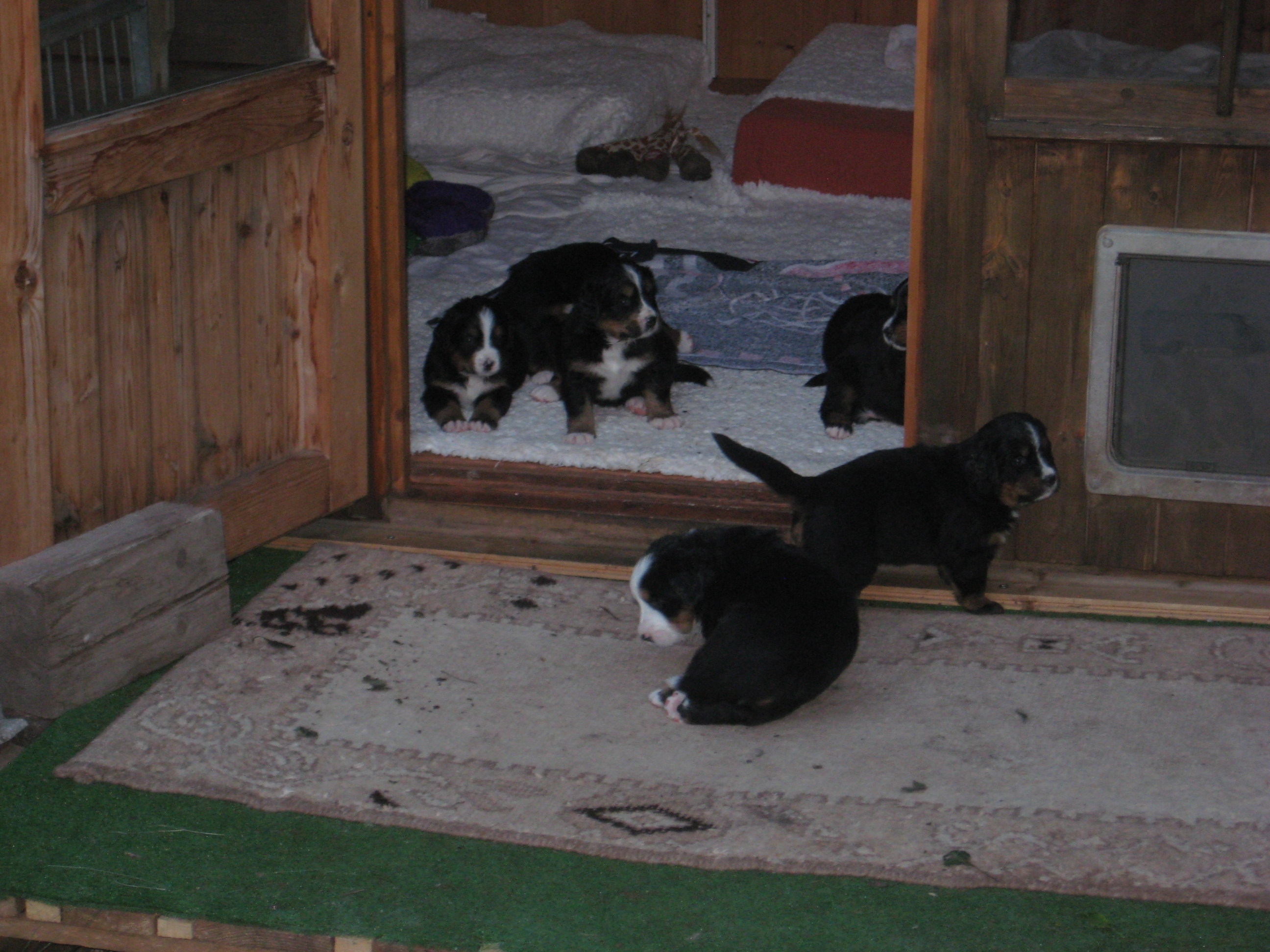 Heute Morgen haben wir die Evi mal bis 7 Uhr schlafen lassen. Man war die glücklich!! Dann durften wir alle wieder ins Häuschen und sofort wurde die Quarkspeise für meine Kids geliefert. Danach heißt es immer noch eine Runde Milchbar bei mir und dann Körperhygiene. Also ich bemühe mich schon sehr, das die Milchschnuten wieder sauber sind. Als es um die Mittagszeit sehr heiß wurde, durften wir in den großen Garten, unter einen Haselstrauch. Das finde ich ganz toll, dort liege ich dann, habe alle Zwerge um mich versammelt und wir genießen das grüne Gras, den Wind und die Haselblätter bewegen sich und die Zwerge knappern daran. Danach brachte Evi uns zur Fütterzeit wieder in den kleinen Welpengarten bis zum Abend. Dort kuscheln wir dann in Evis Küche und sind eine zufriedene Hundefamilie