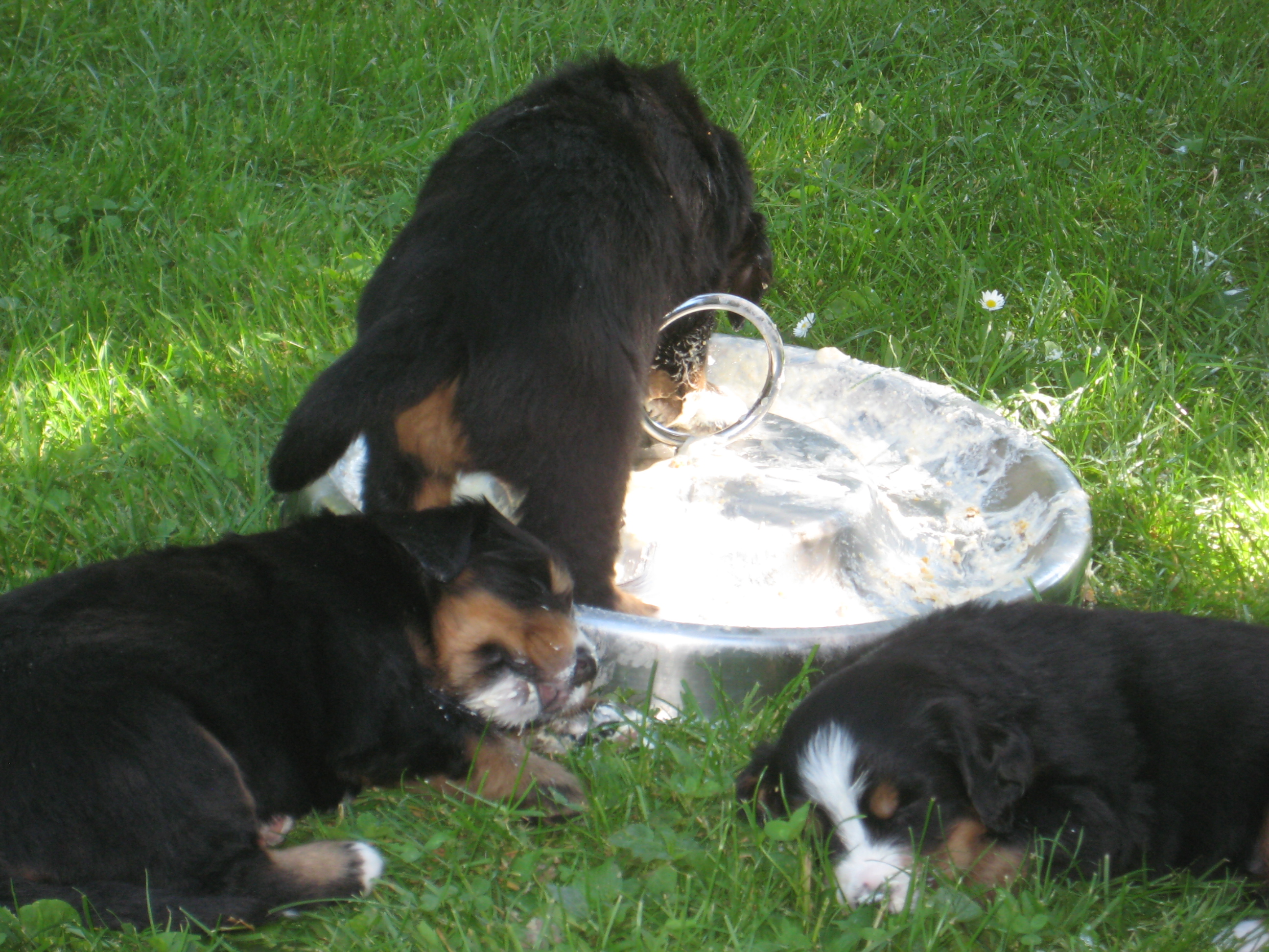 Lieber Fritz, sag mal, wie kann ich den unseren Kleinen Tischmanieren beibringen??? Sie stapfen doch tatsächlich durch ihre Futterschüssel! Also das geht doch nicht. Evi findet es auch schade um das leckere Hühnchen, das sie nun bekommen. Naja ich helfe da schon und schlecke die Reste auf. Aber lieber Papa Fritz, unser Emilio hat doch tatsächlich direkt neben der Schüssel Pipi gemacht und ein kleines bissle ist auch in der Schüssel mit dem Restchen Hühnchen gelandet. Mensch Fritzi, Du als Papa müsstest doch da eingreifen!!! Ist schon ein Malheur mit den Papis außer Haus!! Ansonsten chillen unsere Kinder mit Vorliebe im Garten. Bei dem herrlichen Wetter ist das auch ein Traum und Frauchen ist glücklich weil sich Wäsche in Grenzen hält. Naja sie übertreiben da etwas. Es müssen ja nicht ständig frische Laken sein oder??