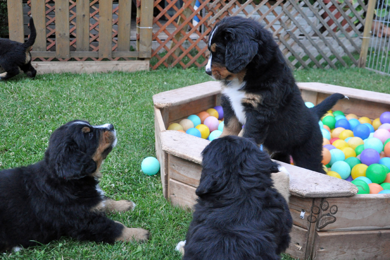 Meinen Kindern gefällt es einfach im Großen Garten besser. Dort können sie Blätter sammeln, Stöckchen suchen und unter dem Baum relaxen. Herrchen hat wieder mal in Eile neue Absperrungen gebaut, weil hinter dem Kompost, der uns streng verboten ist, ist ein Loch, das geht bis Australien. Meine Vorgängerinnen und auch Oma Tana haben da viel gearbeitet und gebuddelt. Wenn man dort nicht acht gibt, kann ein Kleines drin verschwieden. Am Nachmittag hatten wir aber auch viel Spass in der Ballkiste. Und ich habe mit Erziehung begonnen. Ich trage Stofftiere durch den Garten und meine 10er Meute sausst hinterher. Aber sie bekommen es nicht, bis ich es liegen lasse. Danach kann einer das Stofftier haben. Wir üben auch Zerrspiele, was recht lustig aussieht meinte Frauchen. Das allergrößte Geschrei gibt es, wenn sie die Futterschüssel sehen und hören. Da meint man kleine Raubtiere sind am Verhungern. Dabei meinte Evi und Frauchen, sie sind ständig am Futter kochen und rühren. Wobei Hühnchen einfach der Hit sind.