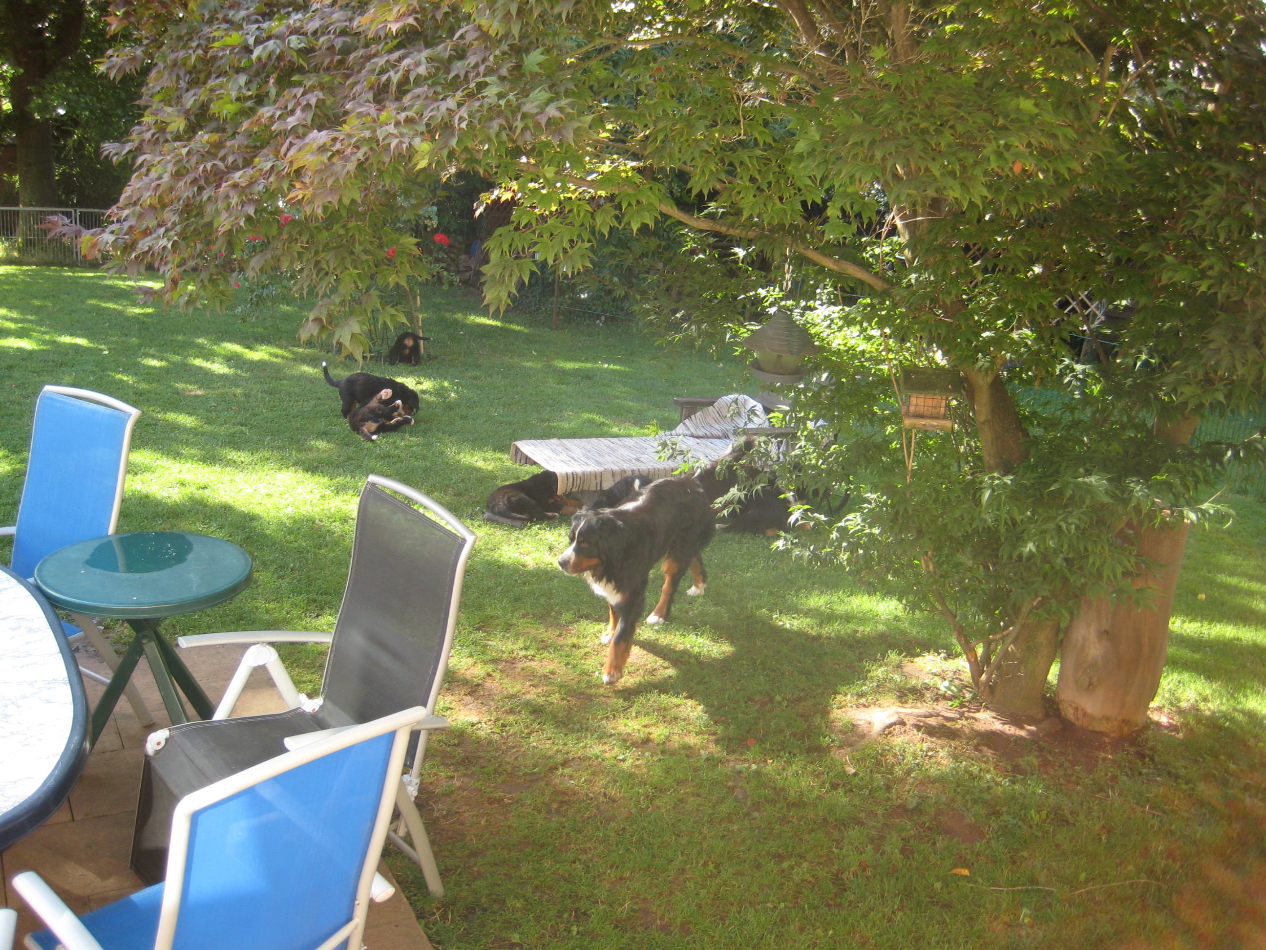 Gestern war ein ganz gemütlicher Tag und ich konnte ohne Besuch mich in Ruhe um meine Kinder kümmern. Wir haben ganz viel gespielt und am Nachmittag kam die kleine Anna, eine Freundin und hat mit meinen Kids gekuschelt. Frauchen meinte es ist wichtig, das ich meinen Kleinen auch in Ruhe Hundebenimm lernen kann. Und dann waren wir mit Elias auf der großen Wiese und haben mal außerhalb vom Garten gespielt und geschnüffelt. Und heute Morgen ging es gleich weiter. Eleni und Estella haben ihre Geschirrchen angepasst bekommen und sie haben zum erstenmal unseren Garten verlassen und sind mit mir, Evi und Frauchen auf die große Wiese gelaufen. Danach kamen gleich Ellinor und Eden dran. Da gab es natürlich bei allen erstmal ein bisschen Gezeeeeter und Gebruste. Aber dann sind alle Mädels durch die Wiese gesaust, immer mir hinter her. Sooo nun werden es, wenn es kühler wird heute die Jungs noch lernen, das am Gartentor die Welt noch nicht zu Ende ist. Ich habe heute noch ganz viel zu tun und bin sehr froh, daß Frauchen und Evi dabei sind und helfen. Ich bin gespannt ob die Jungs genau so schnell lernen wie meine Mädels.