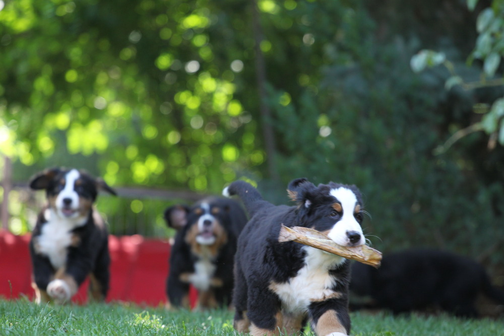 Meine fröhliche lustige Eden hat heute ihr Nest verlassen. Ihr immer lustig wedelndes Schwänzchen wird uns fehlen, meinte Frauchen. Aber dort wo sie jetzt wohnt, wird sie die Hundeprinzessin sein und sehr verwöhnt werden. Sie ist sehr gut in ihrem neuen Zuhause angekommen und Frauchen ist wieder mal stolz, das sie ihr erstes großes Ereignis in ihrem Leben so gut gemeistert hat. Meine 7 kleinen Bernerlein haben heute im strömenden Regen getobt und noch richtig ihre Ballkiste erprobt. Bis Frauchen sie alle abfrottiert hat und ins Häuschen geschickt hat. Dort haben sie dann aneinander gekuschelt seelig geschlafen. Ich habe mal schnell kontrolliert, ob auch alles in Ordnung ist. Für Morgen sind gleich 3 meiner Mädels startklar für den Umzug. Dann habe ich nur noch Jungs im Haus. Die warten auch schon, das sie sich beweisen können. Naja, dann werde ich mich gründlich um Elias kümmern. Denn der kleine Mann bleibt ja bei mir. Da habe ich genug zu tun, ihn die Regeln des guten Bernerbenimm zu lernen.