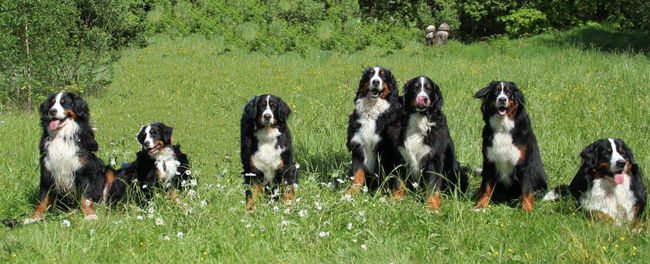 Andy vom Fichta, Zoe vom Fürther Land, Camilla von den Schweizer Franken, Chester vom Schuster zu Gifthal, Alessio vom Mußkönig, Dalessia von den Schweizer Franken, und Alex vom Fichta beim Grilltreff der LG in Grafenwöhr. Die große Bernerfamilie samt Zweibeinern haben den Tag sehr genossen!
